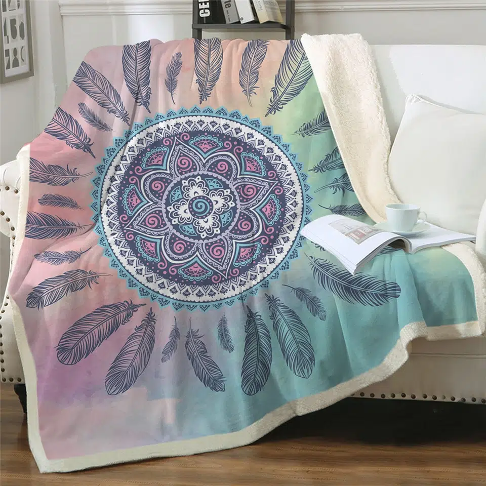 Plongez dans un univers mystique et envoûtant avec notre Plaid bohème mandala à plumes.