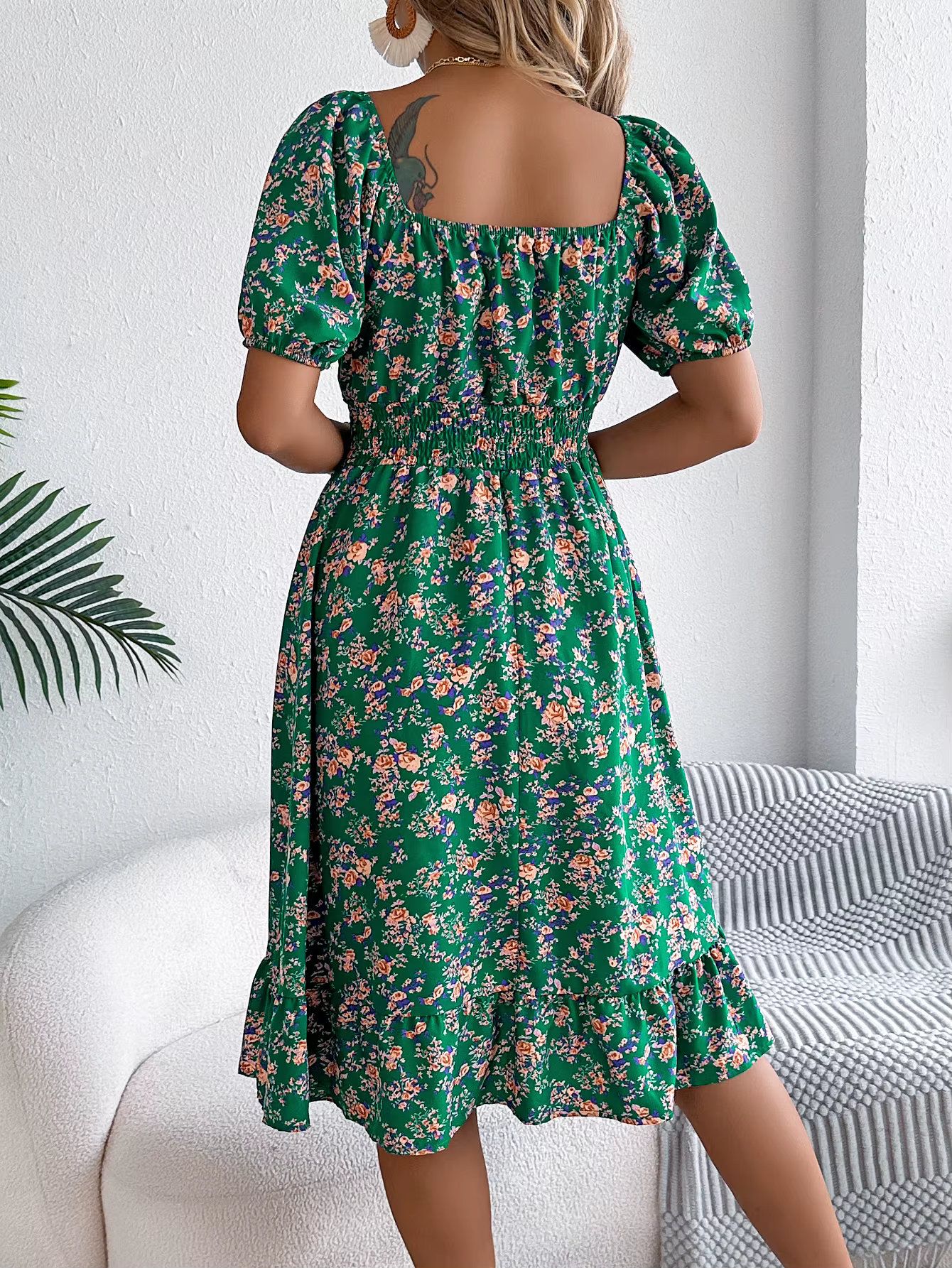 Sentez le doux murmure du vent sur votre peau et les rythmes entrainants d’une guitare lointaine chaque fois que vous enfilez la Robe Courte Bohème à Col Carré Vert.