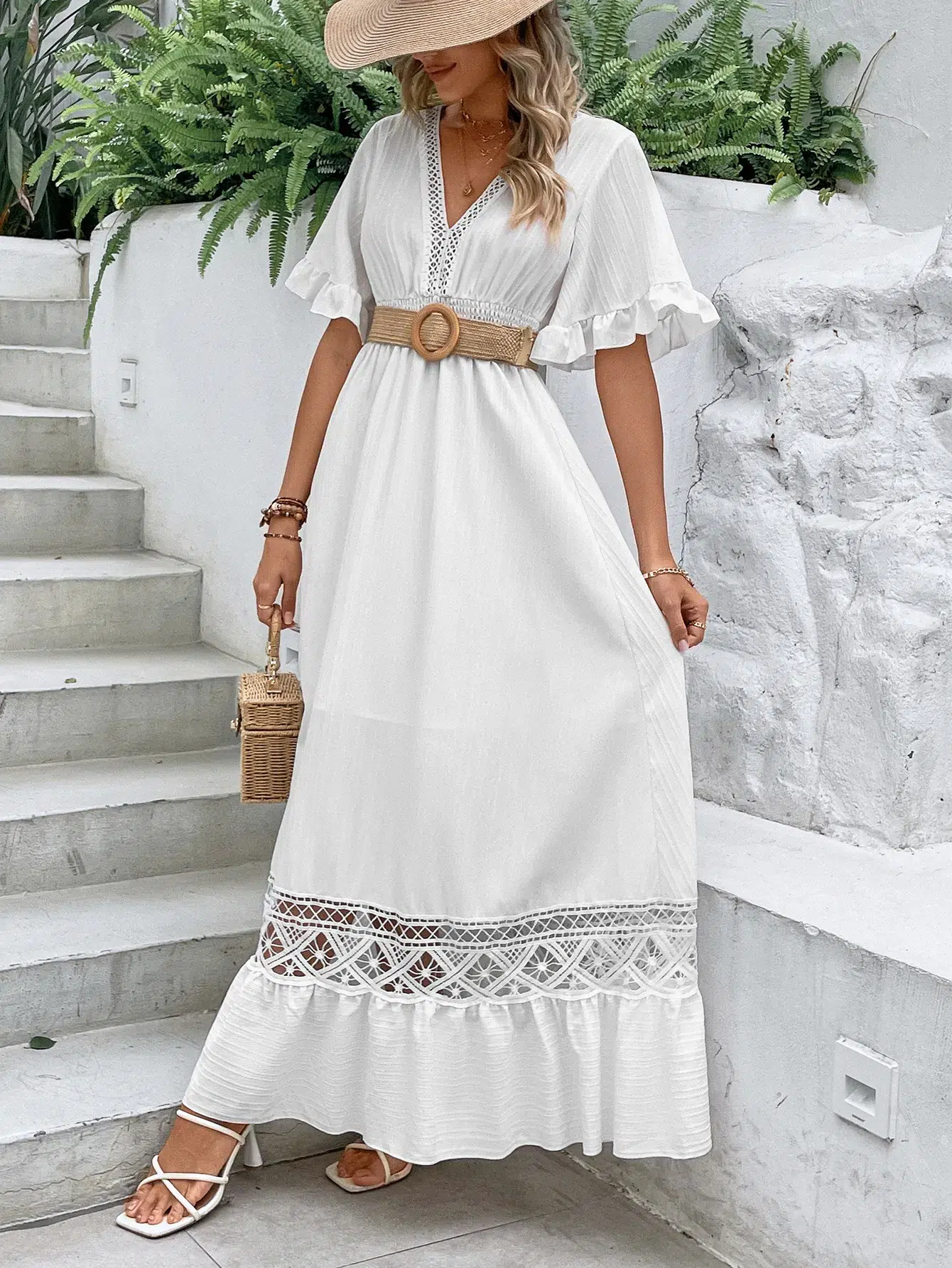 Notre Robe au Style Bohème Blanche en Dentelles est l’incarnation même du charme intemporel, mêlant tradition et modernité.