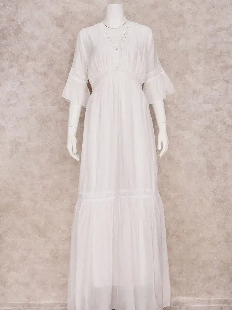 Dans le doux murmure du vent et le chuchotement des feuilles, la Robe Blanche Élégante Bohème en Dentelles danse gracieusement, capturant l’essence même de la liberté et de l’évasion.